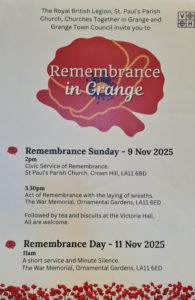 A Civic Service will be held at 2 pm Sunday, 9th November, with the laying of wreaths at the War Memorial in the Ornamental Gardens, followed by tea and biscuits in the Victoria Hall.