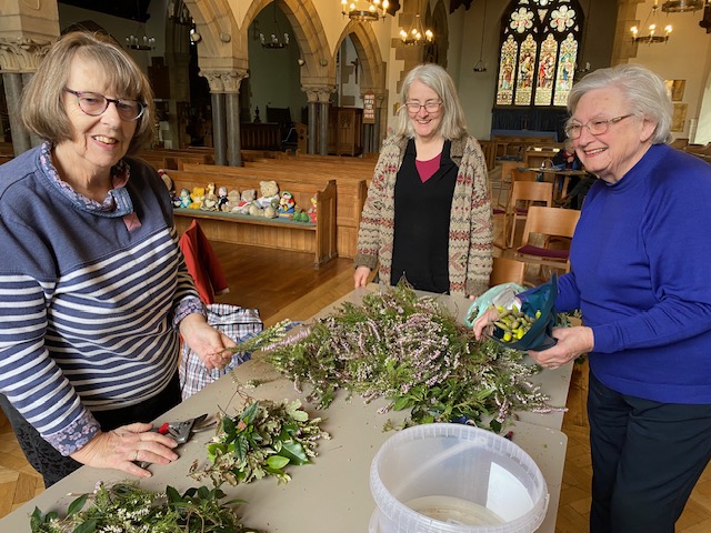A small group gathered in St Paul’s on the Saturday before Mothering Sunday to prepare the posies to be handed out the following day. Bags full of heather – white and purple – arrived, with rosemary, pittisporum, and different kinds of foliage, and two hours were spent making up over 100 posies, with three daffodils in each.