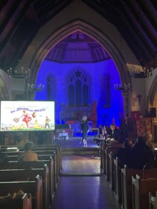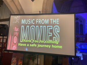 There followed an eclectic and disparate selection of colourful slides and videos, organ renditions, and vocal or electronic renderings, with a pithy and apposite video commentary from Mal, all projected through a powerful sound system which the team had brought with them. Was there a linking theme, we questioned, as we moved from the 007 James Bond theme to Love Actually, The Mission, John Williams’s Ode to the Fallen, a Riverdance line-dance, Ave Maria, Kate Bush, and the 633 Squadron’s theme for a raid on a Nazi V2 rocket launch pad on a Norwegian fiord? Amy’s voice was powerful and tuneful, Mal’s artistry on the organ superb, the additional sound effects from a side drum were riveting, and the slides full of colour and memories of our cinematic past.