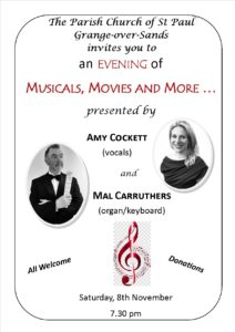 An evening of classic songs and instrumental themes was promised with vocalist Amy Cockett (a busy working mother with a young family who is also a qualified vet with her own practice near Leyburn) and Mal Carruthers (an accomplished and experienced organist with a previous career in the centralized UK music industry). The interest of the audience numbering in the mid-30s was immediately piqued as we entered the church to a darkened auditorium with considerable additional sound equipment, an electronic keyboard, a large video screen with projector, and the chancel area tantalisingly illuminated in a silvery-blue and white wintry light with various poppies on the Remembrance Sunday fall glowing redder than others.