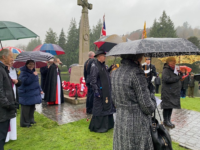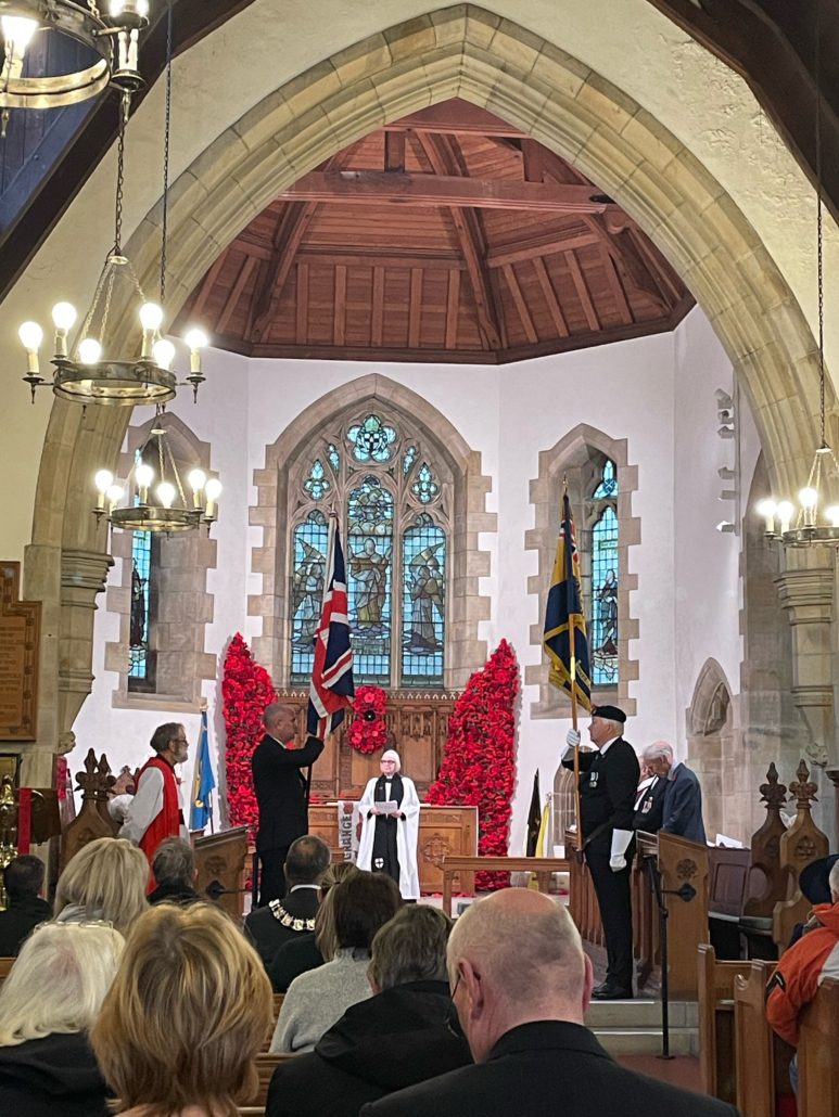 The service was led by the Venerable Penny Driver and the Rt Revd Nigel McCulloch, with contributions from clergy from the Methodist, United Reformed and Roman Catholic Churches. The official guests included Mrs Suzie Bagot as Deputy Lieutenant representing His Majesty the King, Roger Handley as Town Mayor, Tim Farron MP, Peter Endsor from the new Furness and Westmorland Council, and Judith Parrington representing the Royal British Legion. The RBL standard was carried by Martin Wright and the Union Flag by Malcolm Logan. Flags and banners were presented at the altar by local Cubs, Guides and Brownies, and the local Primary School, who also provided a choir to sing ‘Let there be peace on earth’. Lessons were read by a teacher and governor from the School and the newly appointed Manager of the Victoria Hall, and the Mayor read out the names of the 52 local men who had lost their lives in the two World Wars. 27 wreaths were blessed at the altar, presented by members of the various local organisations in the community. Perhaps the most poignant wreath was the one laid by a young girl from Ukraine.
