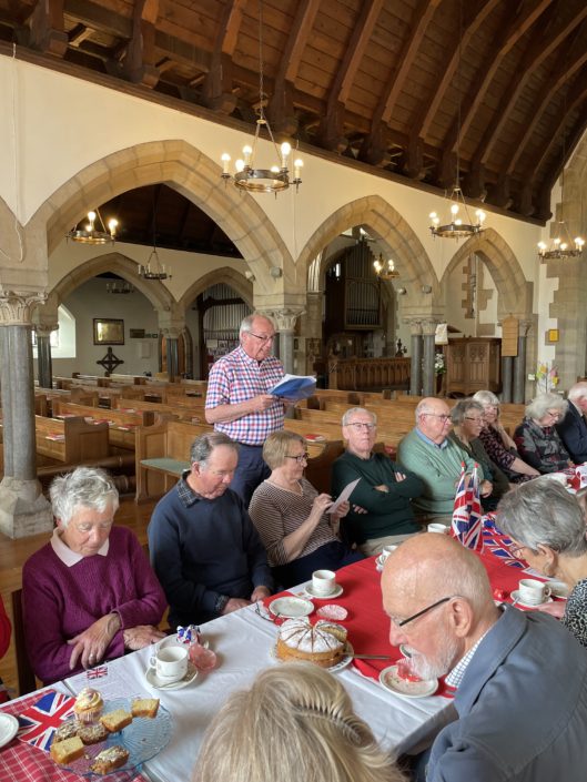 The red and white tablecloths and union jack displays created an appropriate background for the increasing number of plates of sandwiches, baked savouries, cakes and biscuits. The tiered cake stands, holding a variety of delicacies, and the setting out of the crockery made it clear this was going to be a tea party to be remembered – indeed, fit for a King. Forty-six took their seats and, after a welcome and introduction by Brian and grace led by Annette, everyone started to select their refreshments from the wide choice before them. As people happily chatted and ate, they were looked after by a very attentive team of helpers, serving hot drinks and replenishing the platters of food. An observer would witness a large family having a thoroughly enjoyable celebration of the coronation of King Charles III.
