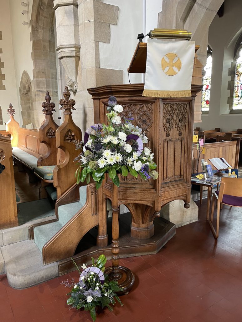 What a pleasure to walk into St Paul’s and see the long colourful table beautifully laid for the celebration tea. The atmosphere was so positive with people smiling and helping to set out the tea. Audrey and her flower team had added to the setting by displaying sprays of purple and white flowers and, placed on a side table, was a magnificent cake made by Emma Walmsley and donated by her father Mark.