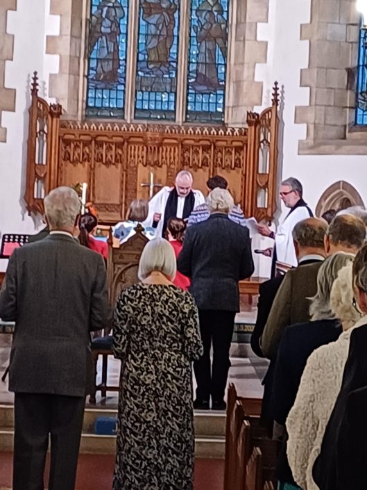 During the service the Rural Dean, the Rev’d John Dixon, invited members of the wider community to greet the new Minister, and symbols of the different aspects of church life were presented to David by members from both Grange and Field Broughton, including two youngsters from the primary school.